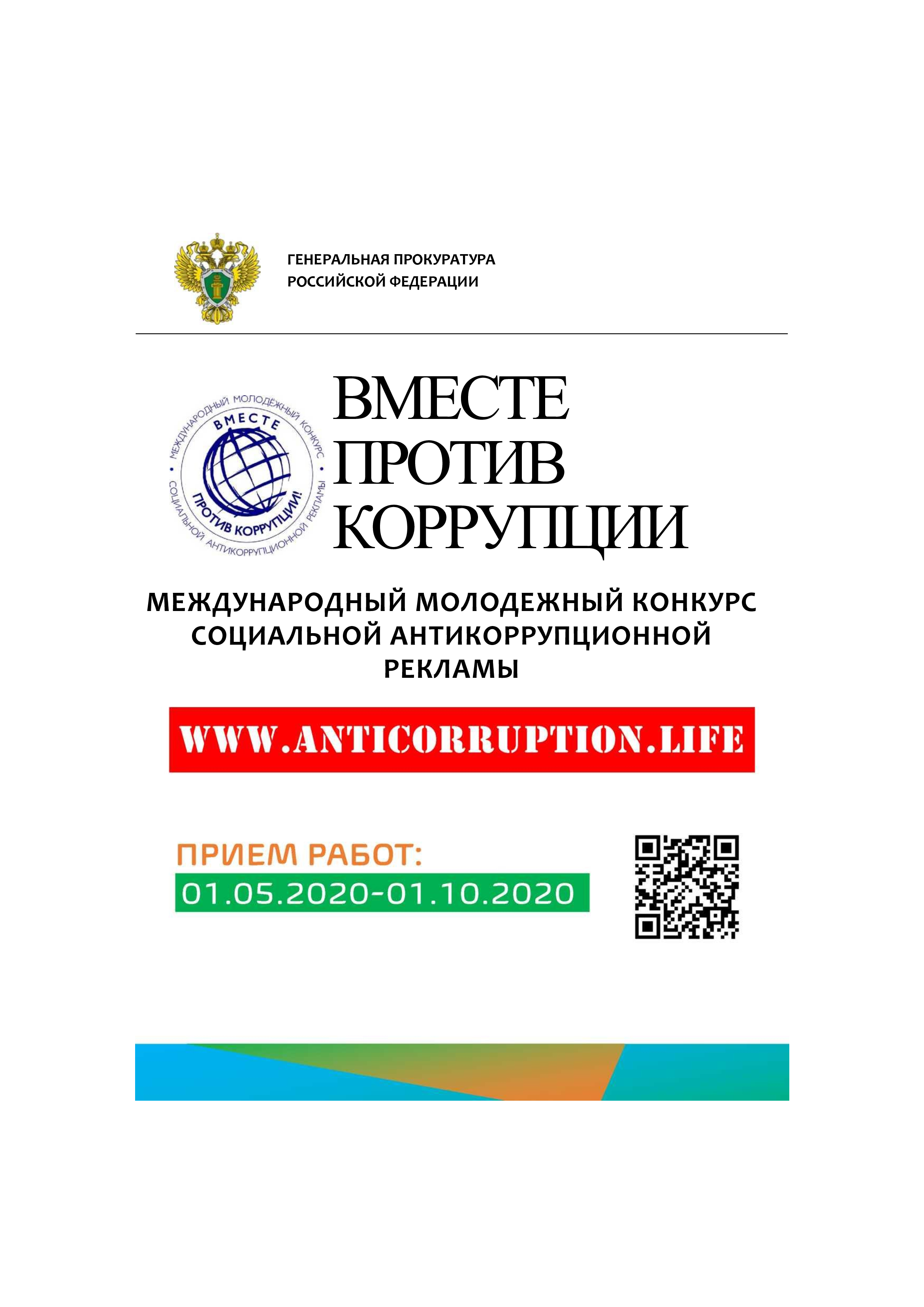 06.05.2020Генеральной прокуратурой Российской Федерации в текущем году организован Международный молодежный конкурс социальной антикоррупционной рекламы на тему «Вместе против коррупции!»