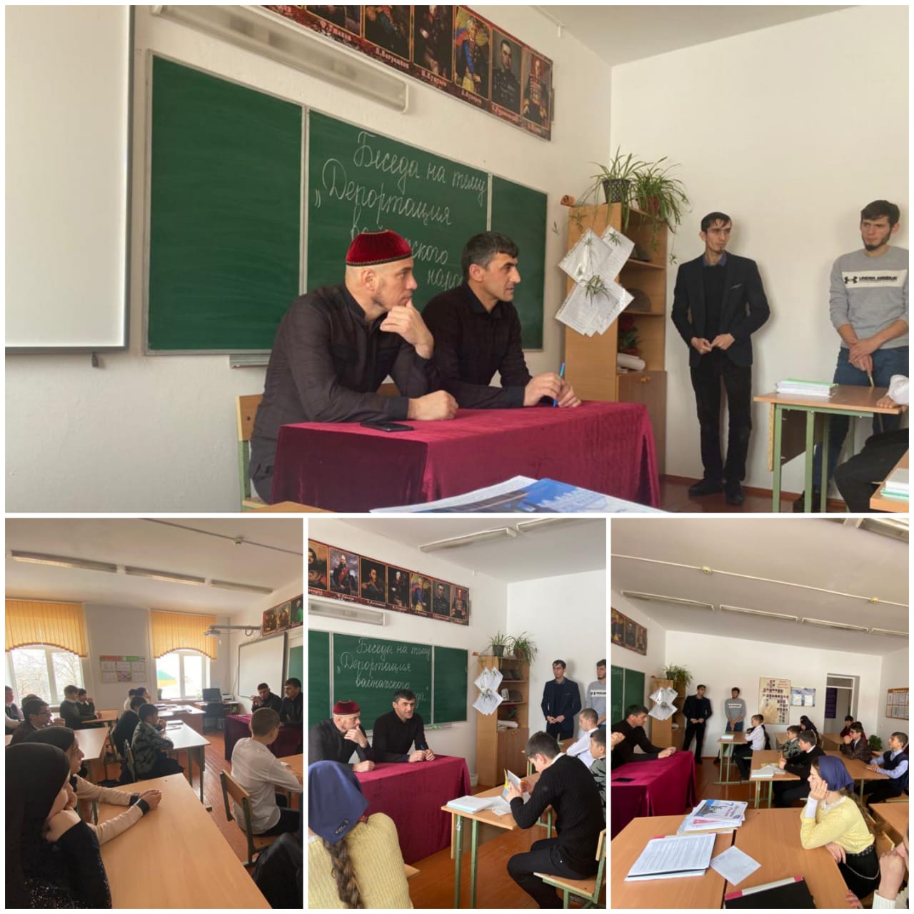 19.02.2021Согласно графику проведения бесед по духовно-нравственному воспитанию подрастающего поколения, 19 февраля с учащимися 7-11 классов педагогом- организатором по ДНВ Салмановым И.Ш. проведена беседа: "Депортация чеченского народа " с целью воспитания уважения учащихся к истории чеченского народа, формирования гражданского долга перед памятью тысяч невинных жертв. Нет в этом мире наказания страшнее, чем насильственное лишение своей Родины. Депортация вайнахских народов 23 февраля 1944 года – одна из самых трагических страниц в истории чеченцев и ингушей.