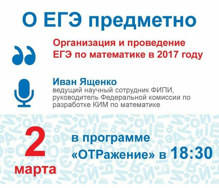 2 марта в 18:30 в программе «ОТРажение» Иван Ященко расскажет об организации и проведении ЕГЭ по математике в 2017 год http://otr-online.ru/online/