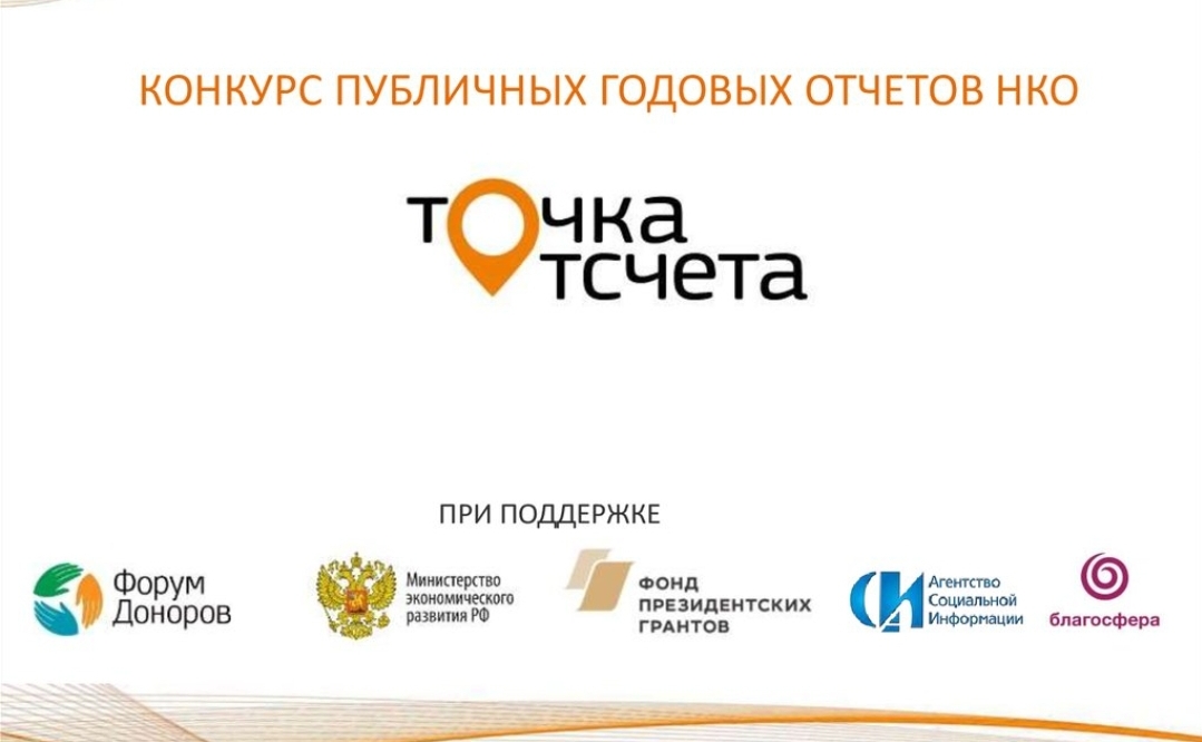 16.09.2022«Форум Доноров» начал прием заявок от НКО на XIII Всероссийский конкурс добровольных публичных годовых отчетов «Точка отсчета». Его главная цель — повысить доверие к некоммерческим организациям со стороны общества, власти, бизнеса и СМИ через развитие культуры прозрачности. Прием заявок продлится до 10 октября 2022 года. Подробнее о конкурсе по ссылке: https://contenta.info/pages/tochka.