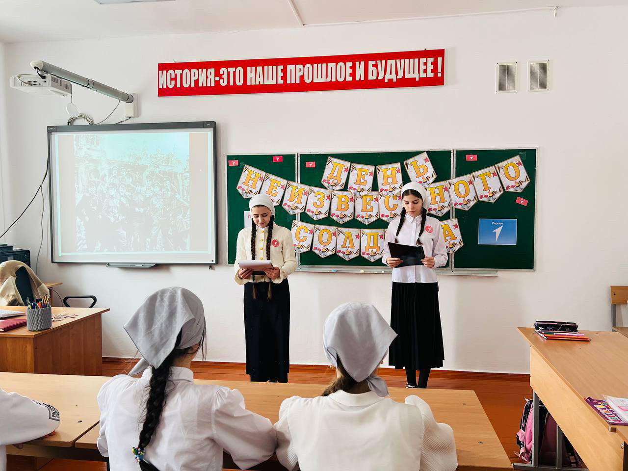 Сегодня в МБОУ «СОШ с.Булгат-Ирзу им.Х.А.Арзамиева» был проведен тематический классный час ко Дню неизвестного солдата.