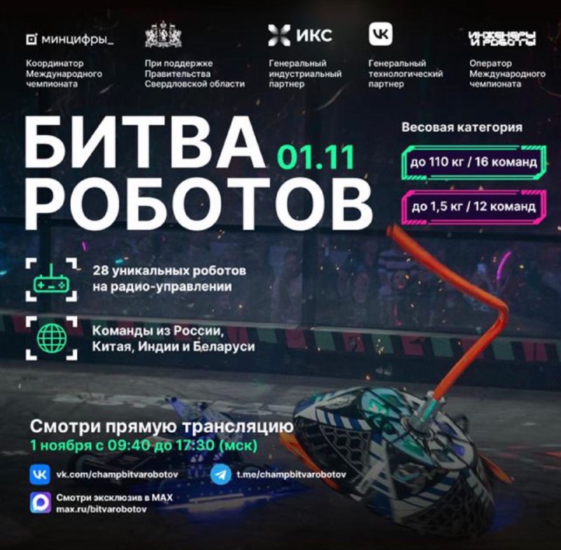 29.10.2025Минцифры России в соответствии с распоряжением Правительства Российской Федерации от 11 апреля 2023 г. № 889-р сообщает о проведении четвертого отборочного этапа Международного чемпионата по битве роботов сезона 2025 года (далее - Чемпионат, мероприятие). Цель Чемпионата - популяризация в Российской Федерации инженерной мысли как драйвера развития и поддержки современных цифровых технологий. Три отборочных этапа Чемпионата прошли на территории Пермского края, Московской и Ленинградской областей, в которых приняли участие 84 команды со всего мира, из них только 24 команды встретятся в финальном этапе, чтобы побороться за титул чемпиона битвы роботов 2025 года. На текущий момент прямую трансляцию этапов посмотрели более 14 млн человек, свыше 18 тыс. человек посетили отборочные этапы. В четвертом отборочном этапе Чемпионата сразятся 28 команд из России, Беларуси, Индии и Китая: 16 команд в рамках дисциплины «Битва роботов» в весовой категории до 110 килограмм и 12 команд в рамках дисциплины «Битва мини-роботов» в весовой категории до 1,5 килограмм. Среди участников - команды МТУСИ, СПбГУТ им. М.А. Бонч-Бруевича, Высшей Школы Нефти, МИСИС, ИТМО, СПбПУ Петра Великого, ДГТУ, МИРЭА, НГТУ НЭТИ и других ведущих университетов. Мероприятие пройдет 1 ноября 2025 г. с 11:30 до 19:30 (по местному времени) при поддержке Правительства Свердловской области на территории Международного выставочного центра «Екатеринбург-ЭКСПО» по адресу: Свердловская область, г. Екатеринбург, ЭКСПО-бульвар, д. 2. Программой мероприятия предусмотрено два шоу: дневное (с 13:00 до 14:30) и вечернее (с 18:00 до 19:30).